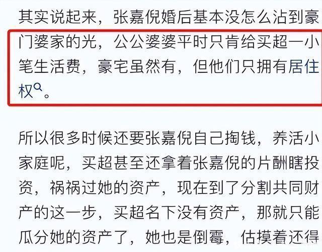 他们刚结婚的时候,家里就已经不让买超插手任何生意,而且他也没有任何什么固定的收入,只有家里给他的部分生活费。 他们这样做,就是不想让买超在婚后赚钱变成夫妻资产,免得到时候离婚,张嘉倪会分到他们家族的钱。