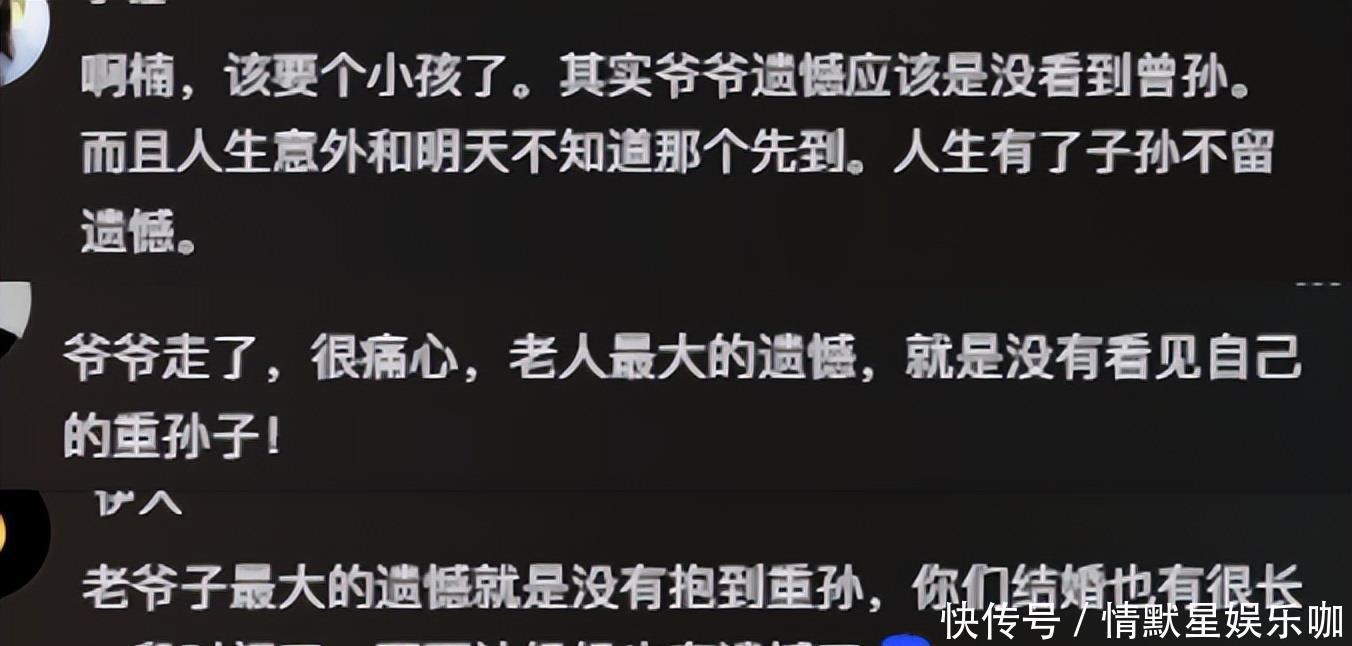 之前阿楠爷爷去世,本身阿楠当时就很难过,可结果放眼评论区却到处充斥着催生的话题,说什么爷爷走了很痛心,老人最大的遗憾就是没有看见自己的重孙子等等。
